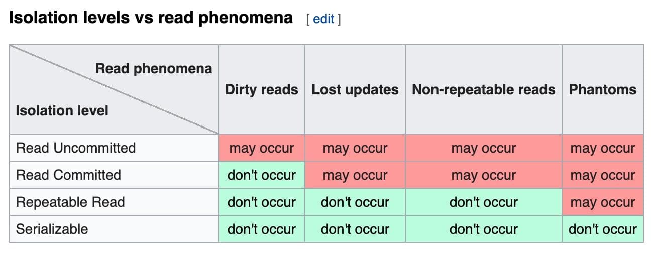Wikipedia has a pretty great summary chart for wrapping up how these isolation levels help avoid the SQL standard read problems: