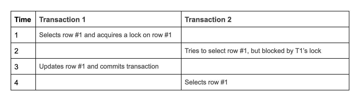 Time Transaction 1 Transaction 2 1 Selects row #1, acquires lock on row #1 2 Tries to update row #1, but is blocked by T1’s lock 3 Selects row #1, commits transaction 4 Updates row #1