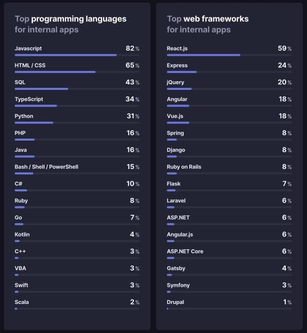 One step deeper, the programming languages of choice are JavaScript, HTML/CSS, SQL, TypeScript, and Python. The frameworks of choice are React, Express, jQuery (surprising!), Angular, and Vue.js.