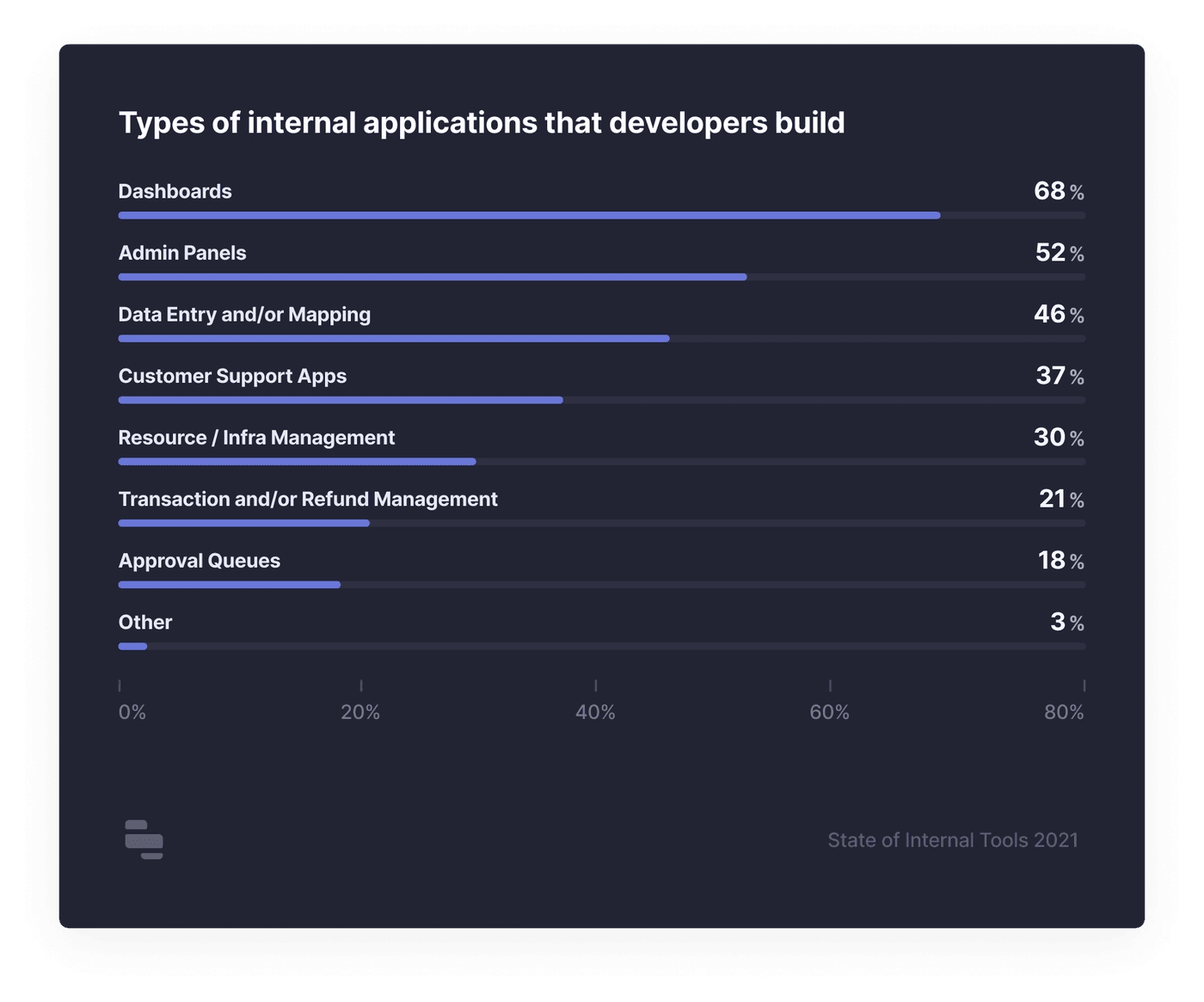“Internal tools” are primarily being built for information management: dashboards, admin panels, data entry, customer support apps, or general management.