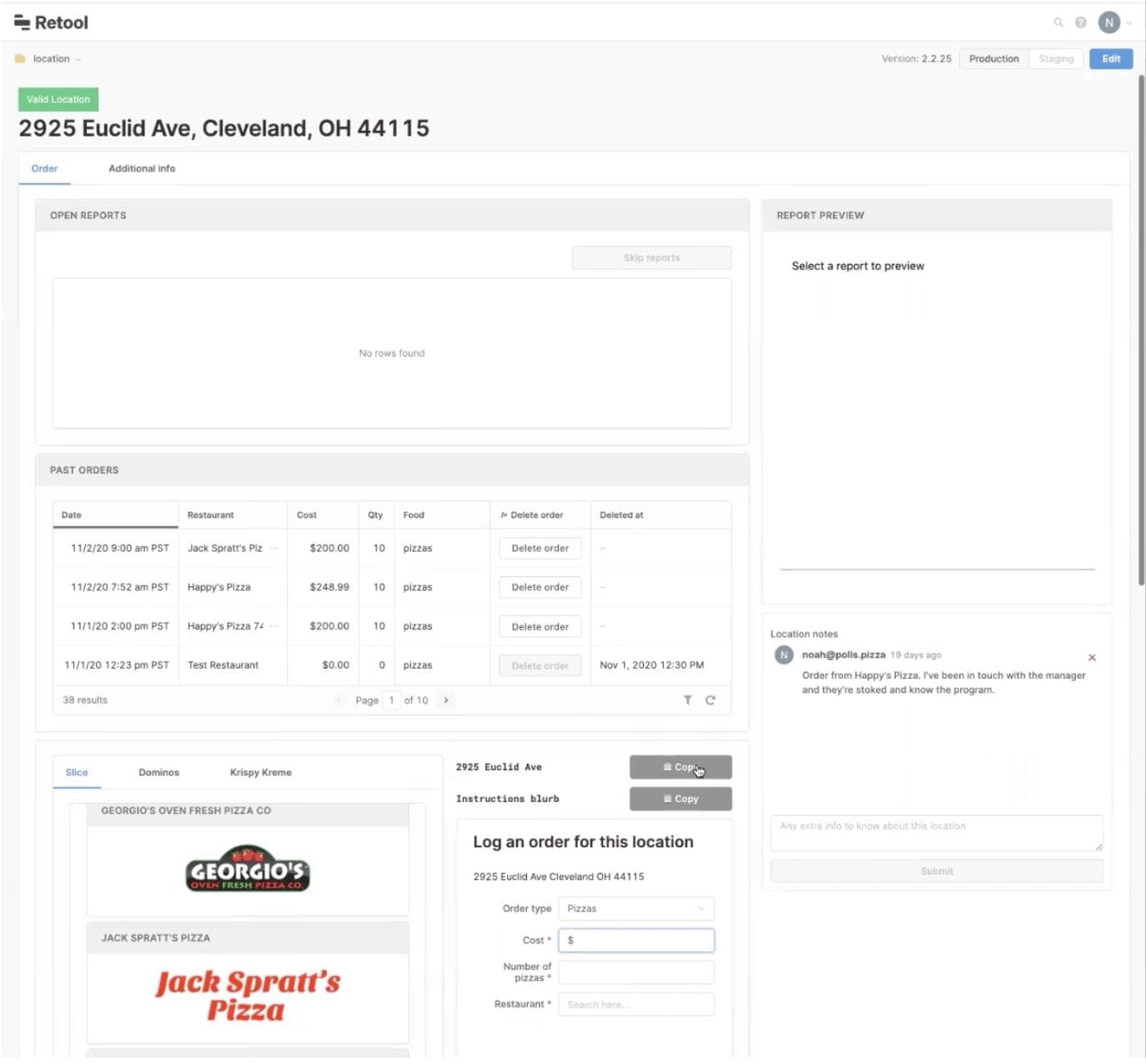 Today, Pizza to the Polls uses Retool as a frontend for their database and for overseeing most requests and pizza delivery data. For example, when they receive an order from someone requesting pizza at a busy polling place, they navigate from their ticketing system to their main Retool app. There, they can see the location ID, all information about the polling place, open reports (requests for pizza), past orders, and get quick delivery options for pizza spots nearby.