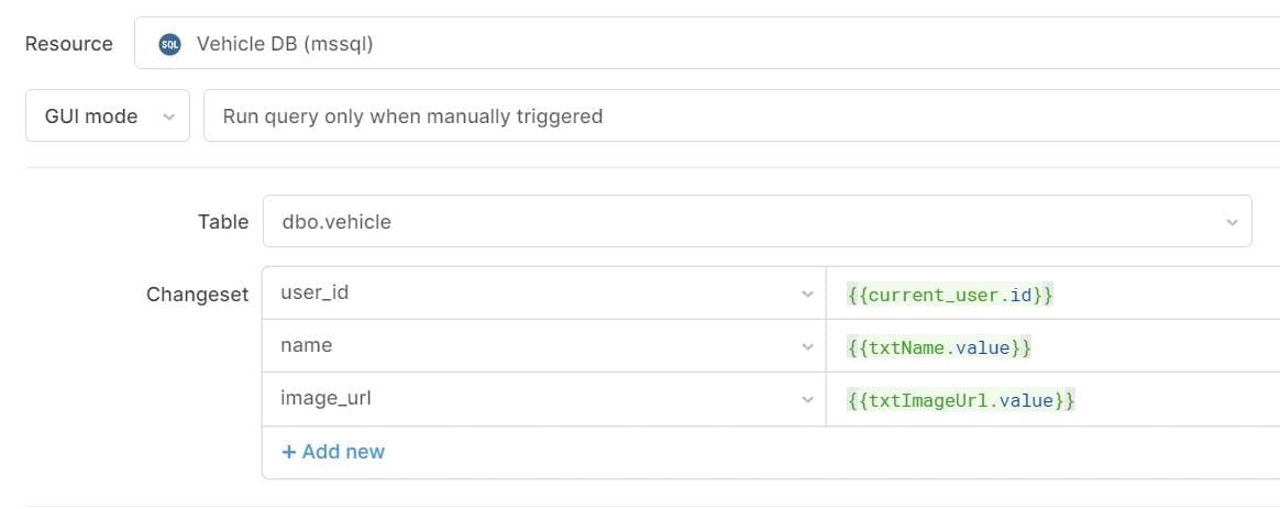 You should see the new query selected in the query editor at the bottom of the screen. Select your database in the Resource drop-down. Make sure GUI Mode is selected in the drop-down just under the resource selector. Next select the dbo.vehicle table and set Action Type to Insert a record.