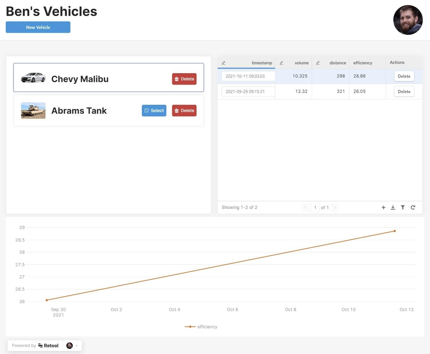 To demonstrate this process, you’ll create a prototype of an app that tracks your vehicle’s fuel economy using Retool. The app will allow you to select and delete vehicles, add fuel expenses, and chart those expenses over a period of time. The app will also be accessible by multiple users in your organization and publicly shareable.