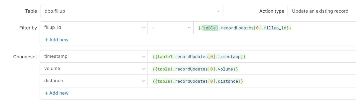 The last action you’ll be able to do from this table is to delete a record. Create a query to delete the row in the GUI mode and set the action to Delete a Record. You can use the table’s selectedRow property in this query to set the fillup_id filter {{fillups.selectedRow.data.fillup_id}}.