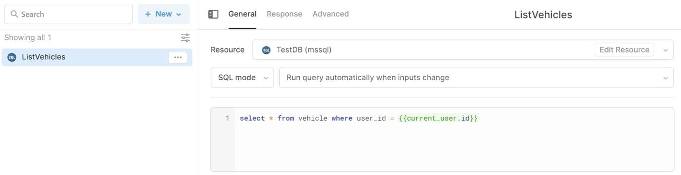 To list a user’s vehicles, you’ll need to run a SQL query. In the query editor, double-click on the default query query1 and rename it to ListVehicles. Make sure your database resource is selected, then enter select from vehicle where user_id = {{current_user.id}} into the query field. Click Save & Run and you’ll see a list with the vehicle you added.