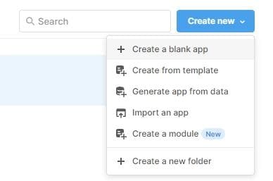 Switch to the Apps tab at the top of the screen. Click Create New, then Create a Blank App. A dialog will open asking for a name. Enter “Fillups” and click Create App.
