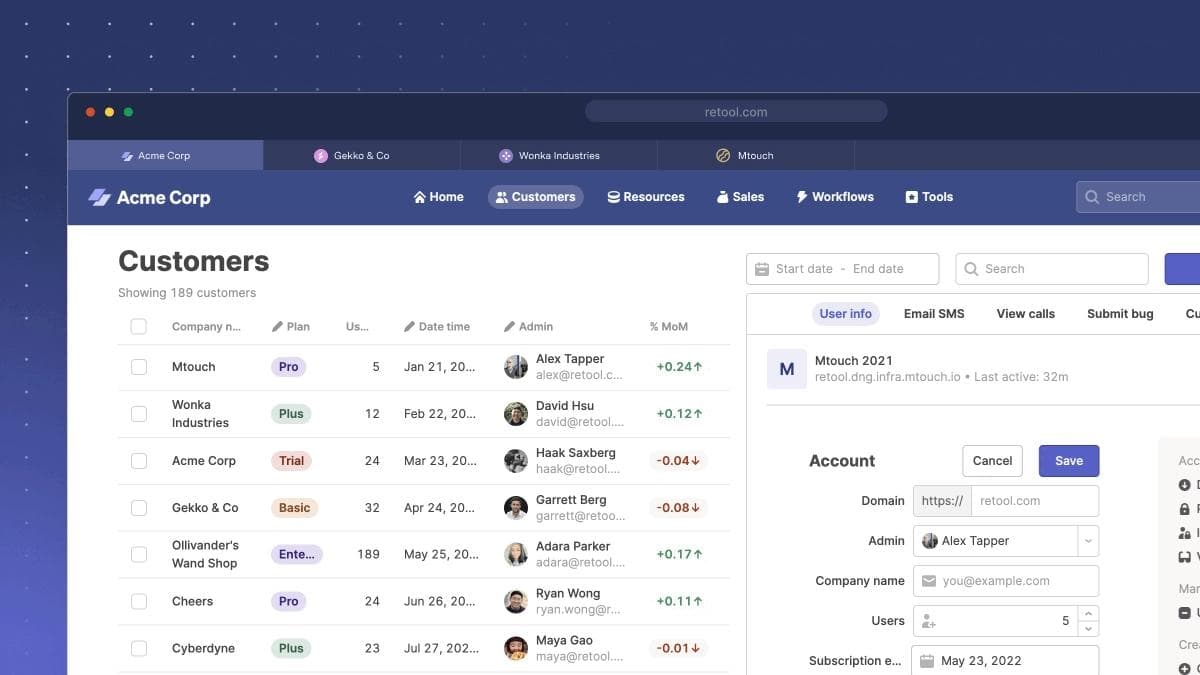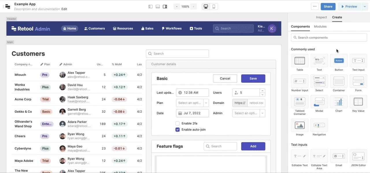 Retool helps developers build internal tools. To make the experience as fast as possible, we offer a library of tables, charts, forms, buttons inputs, and other production-ready UI components that you can quickly assemble into any interface.