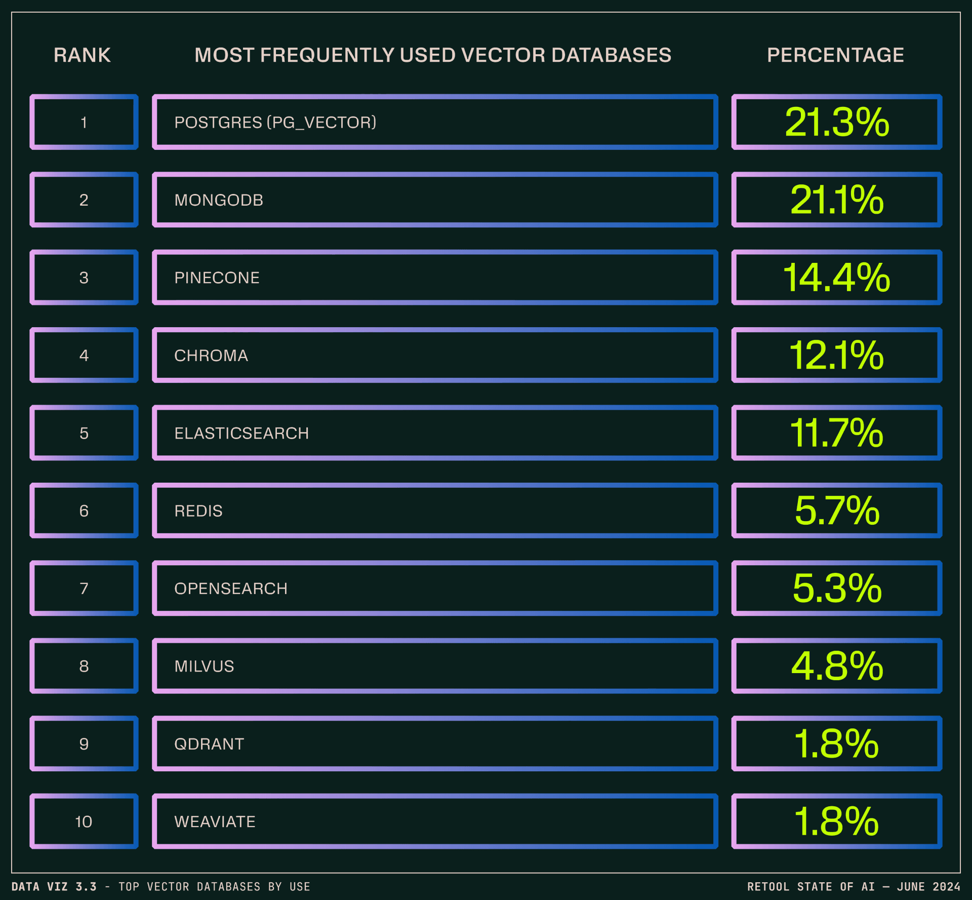 Today, most respondents reported using vector DB (63.6%)—a big leap from 2023’s 20%. (And the more people use their vector DB, the more they recommend it. Which came first, the chicken or the egg database?)
