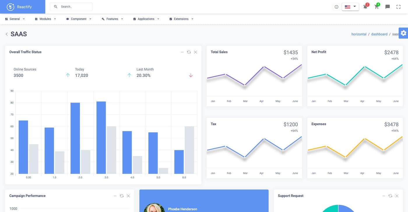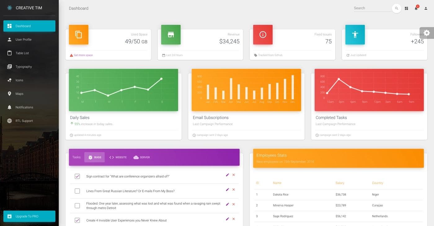 If you’re building a customer facing app, Reactify is an excellent option. Reactify developers specifically studied the requirements for SaaS applications — like project management, task management, and sales analytics — and designed this template with that in mind. It should be noted that if you plan to sell the application you build with Reactify, you are required to purchase an extended license for $699.