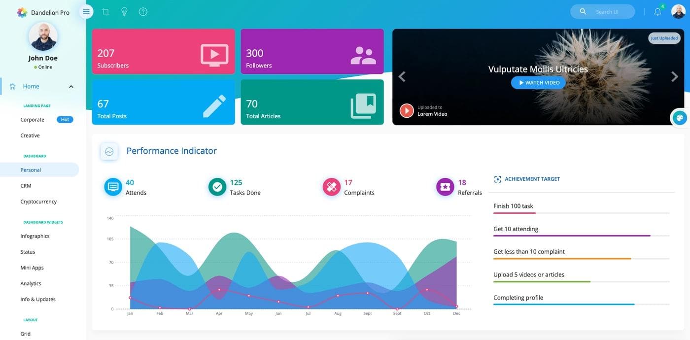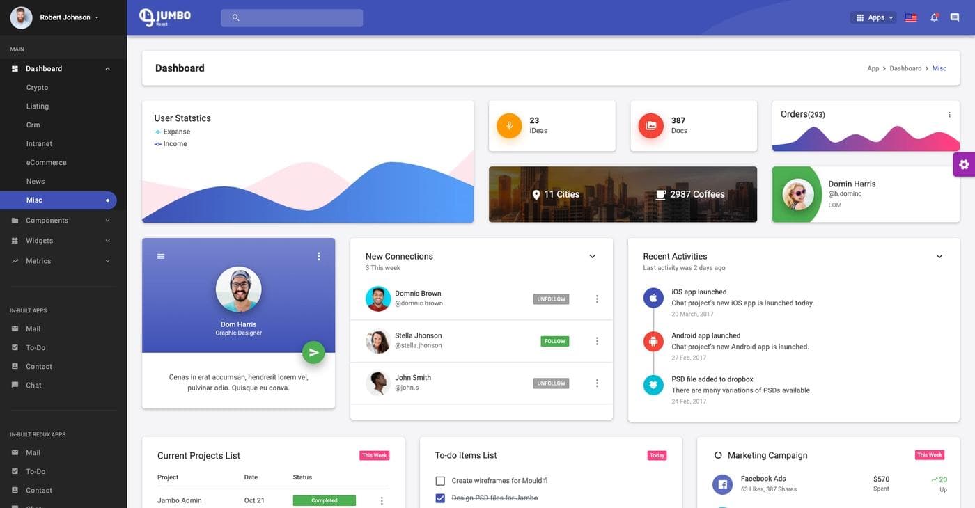 While every React admin template in this list has a good number of reusable UI components to choose from, Jumbo has the most extensive list. With more than 450 UI components (including carousels, popovers, progress bars, subscription bars, and user statistics), this template makes it easy to customize your admin dashboard with very little custom code.