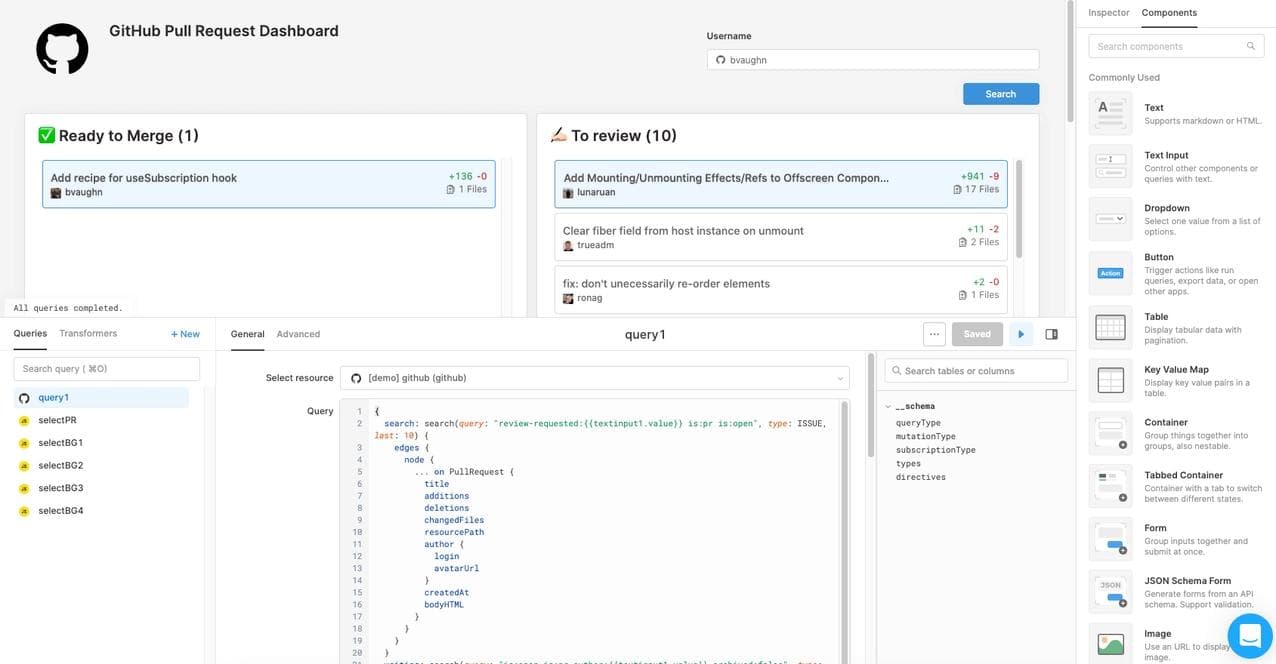 For this IDE, most of the workable space is split into the top and bottom half of the screen. The top section is where you’ll drag-and-drop visual components for building out your tools. You can click on components to edit details (if you’re familiar with React, props) on the right side panel. The bottom half of the screen is where you can write out and configure your queries, as well as explore your schema. In the screenshot up top here, you’re seeing a fully functional Github PR dashboard using their GraphQL API.