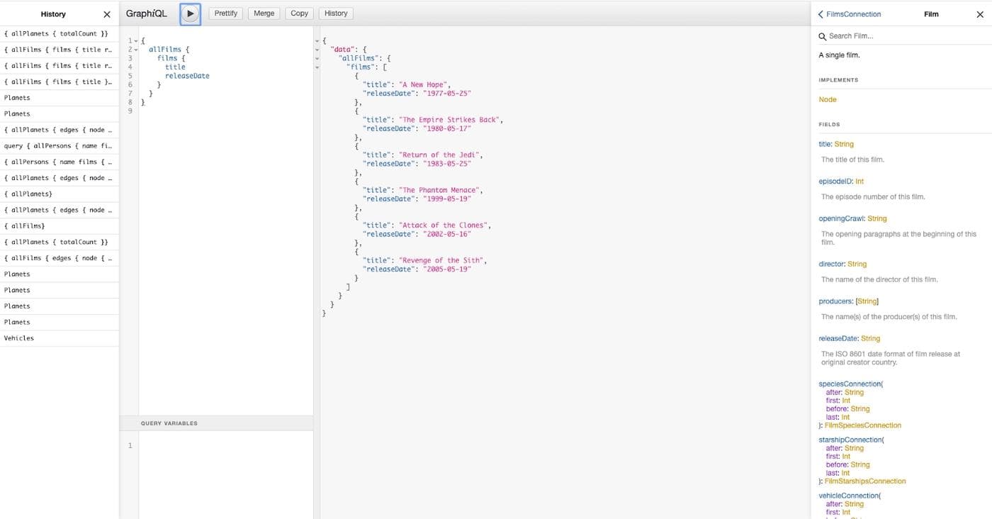Use the “Docs” tab of the documentation column to see more details about the queries. For example, the film type in the image to the left shows the fields that make up the type. Each film has a field characters, which is an array of the person type. If you click on a field, you can expand documentation even further to get more type details.