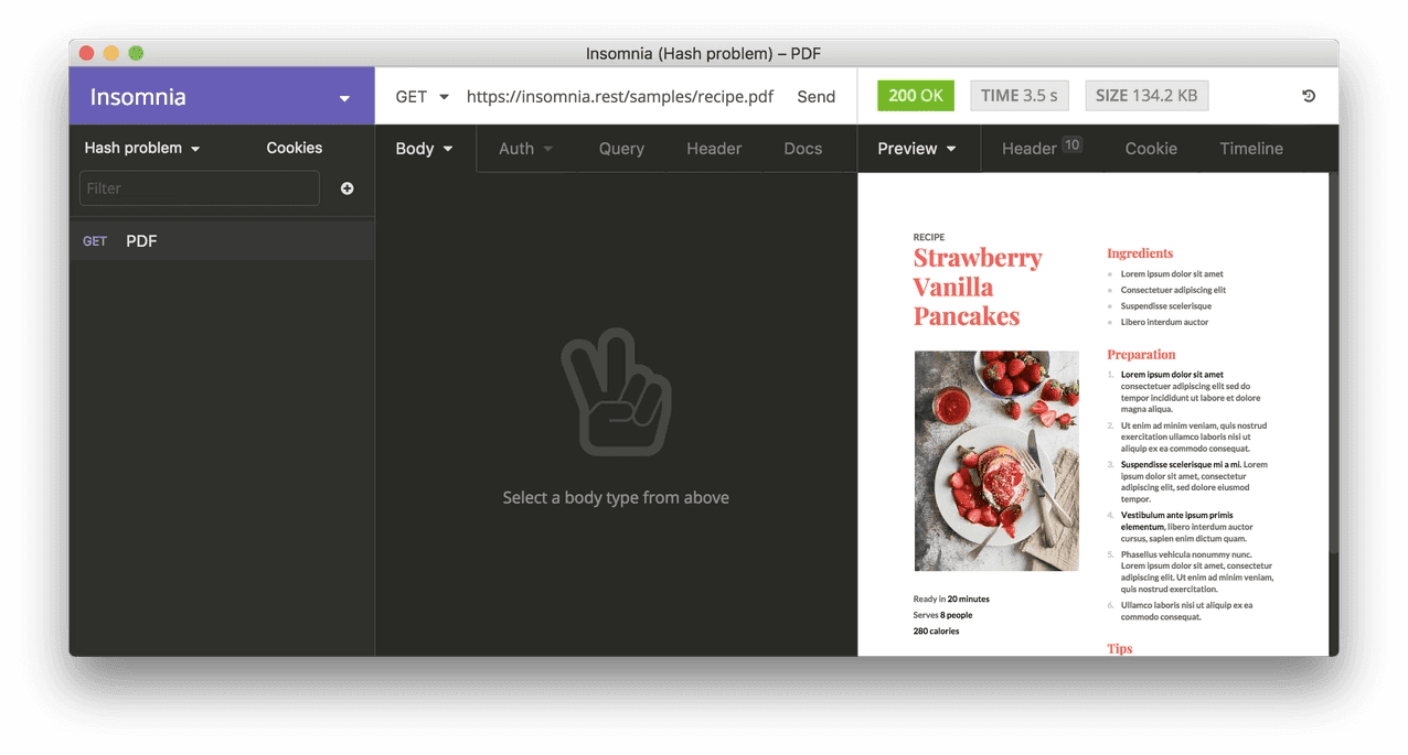 GraphQL-specific features include query completion on field names and arguments, which speeds up typing out queries. Insomnia can also error check schemas in real-time.