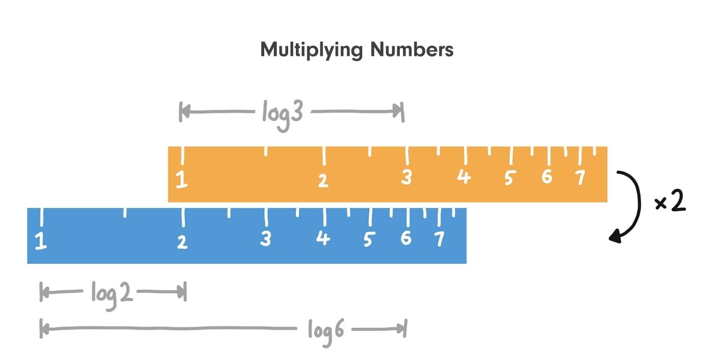 If we had two sticks with logarithmic scales, we could use them to add logarithms together in the same way. But as we know, adding logarithms lets us multiply numbers!
