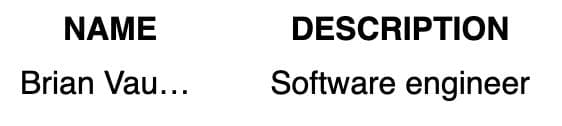 After importing and using the column and table components via the code snippet above, you would end up with an output that includes two columns--name and description--each with one value under them.