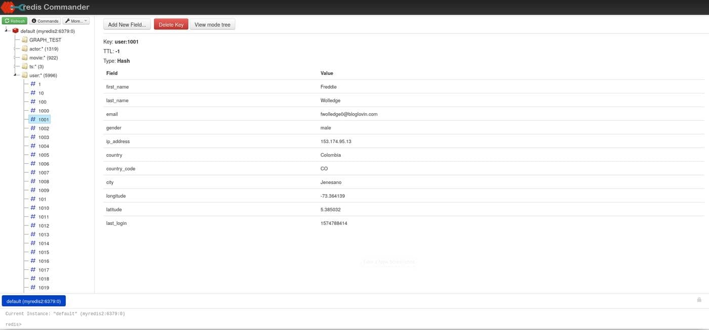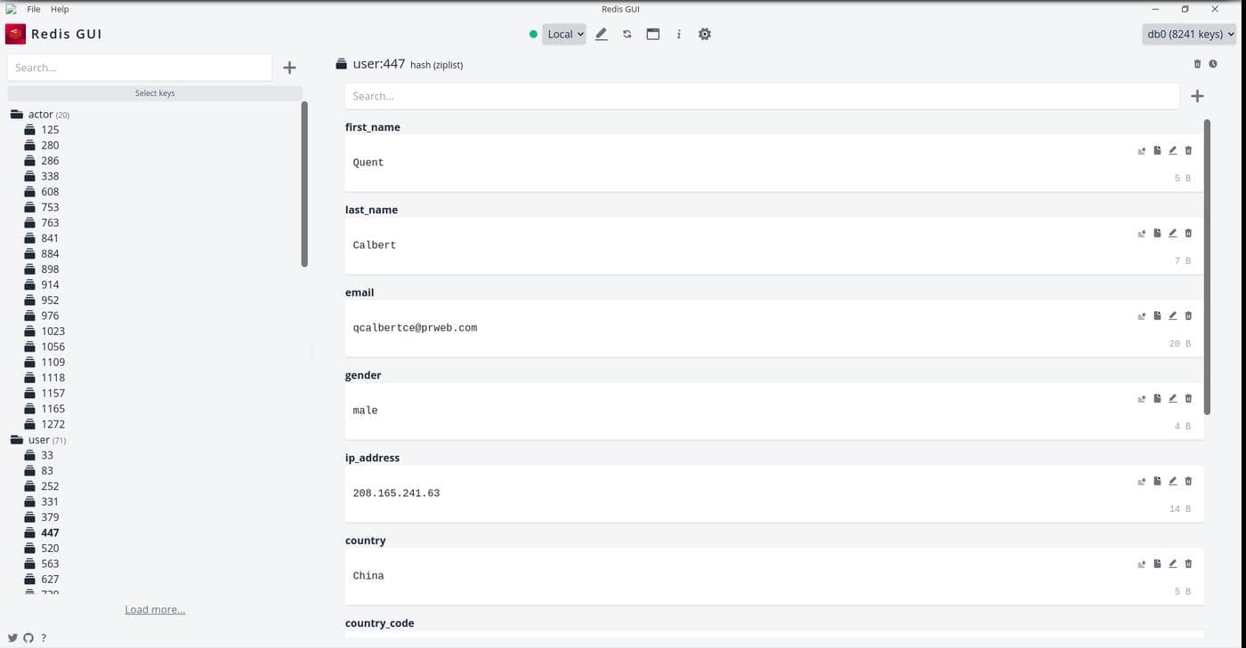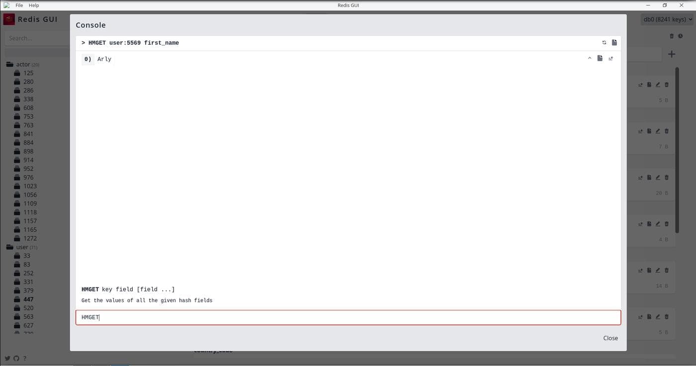 One nice feature of Redis GUI is namespace support. If you use a colon(:) character to introduce namespaces in your data, entries in the same namespace will be grouped together in Redis GUI. As you can see in the screenshot, keys beginning with user:, movie: and actor: have been grouped separately.