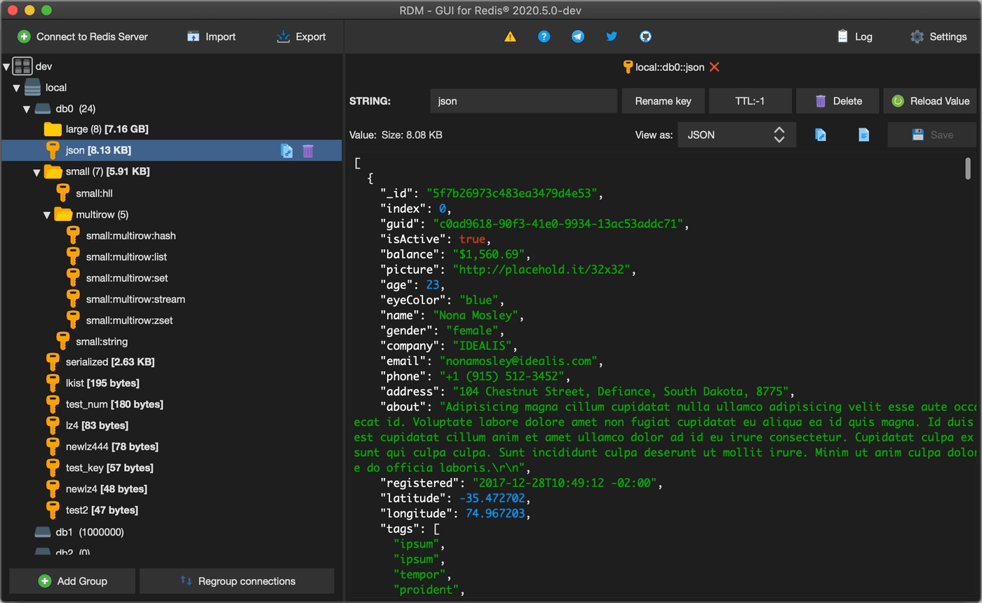 Apart from supporting TLS, Resp.app supports TLS-over-SSH, giving you all round strong security. It supports all the latest Redis features like ACL, RedisJSON, and Streams, and can display JSON, MsgPack, PHP, Pickle, Numpy, Pandas, and binary data in human readable form. It can also decode Brotli, LZ4, ZSTD, Snappy, GZIP, Magento Cache, and Sessions. Using its Extension Server, it's possible to add support for more serialization formats. Like RedisInsight, it comes with a memory profiler to analyze your Redis instance.