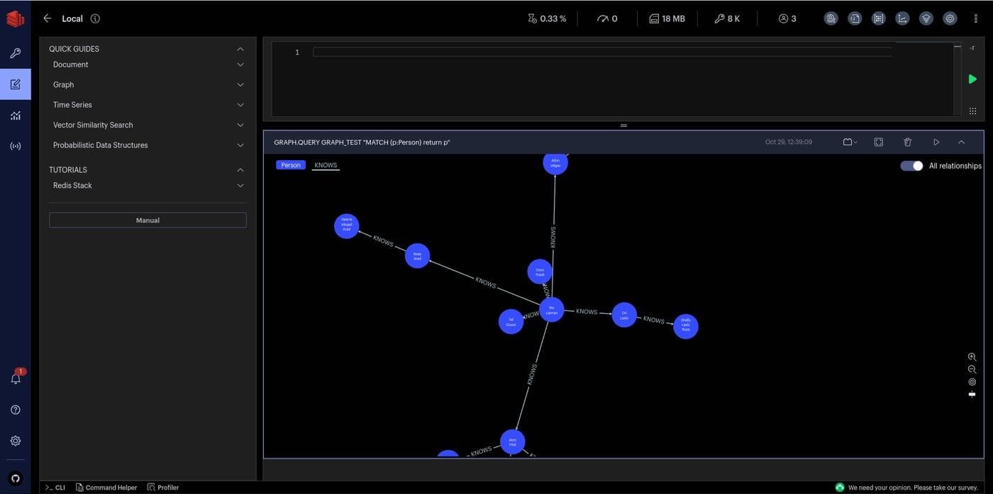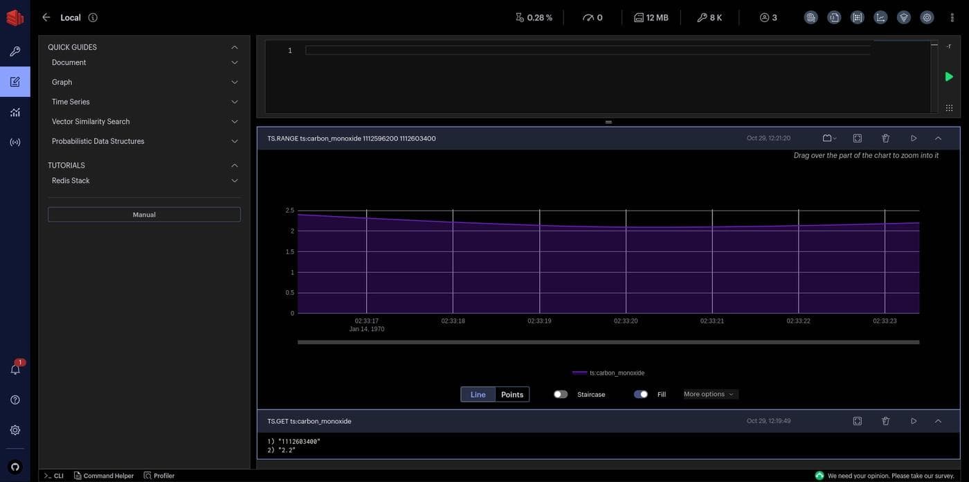 You can also use the Redis CLI from within RedisInsight. You get comprehensive interactive documentation, syntax highlighting, and autocompletion, which is a bit nicer than your terminal.