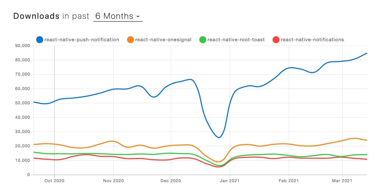 Specifically, react-native-push-notification has over 5,600 stars, while the closest competitor (react-native-notifications) has less than half that number. The raw report has more information, but as you can see from just the download statistics below, it is clear that react-native-push-notification is by far the most popular React Native notification library.