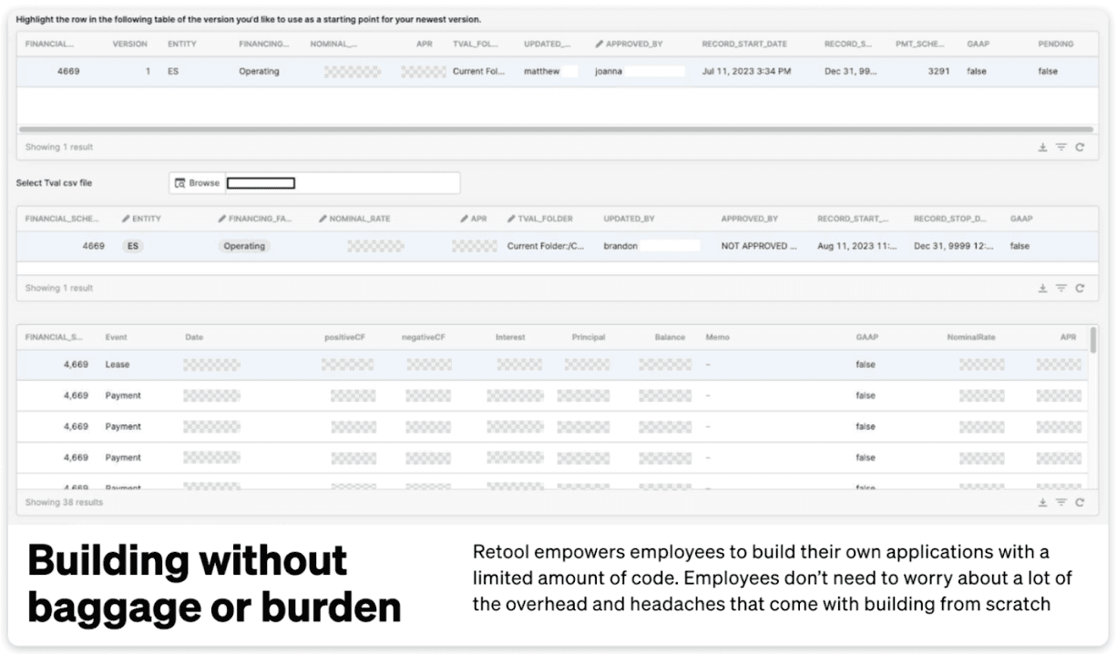 After building the market data app, Mark’s team quickly scaled their use of Retool to more complex, multi-user applications. A rate setting app followed, which allowed Mark’s team to collaborate with the sales leaders more efficiently during the company’s rate setting process. This meant the team no longer had to use spreadsheets to manage rate updates and also eliminated the need for constant communications over Slack, phone, and email to manage user feedback.