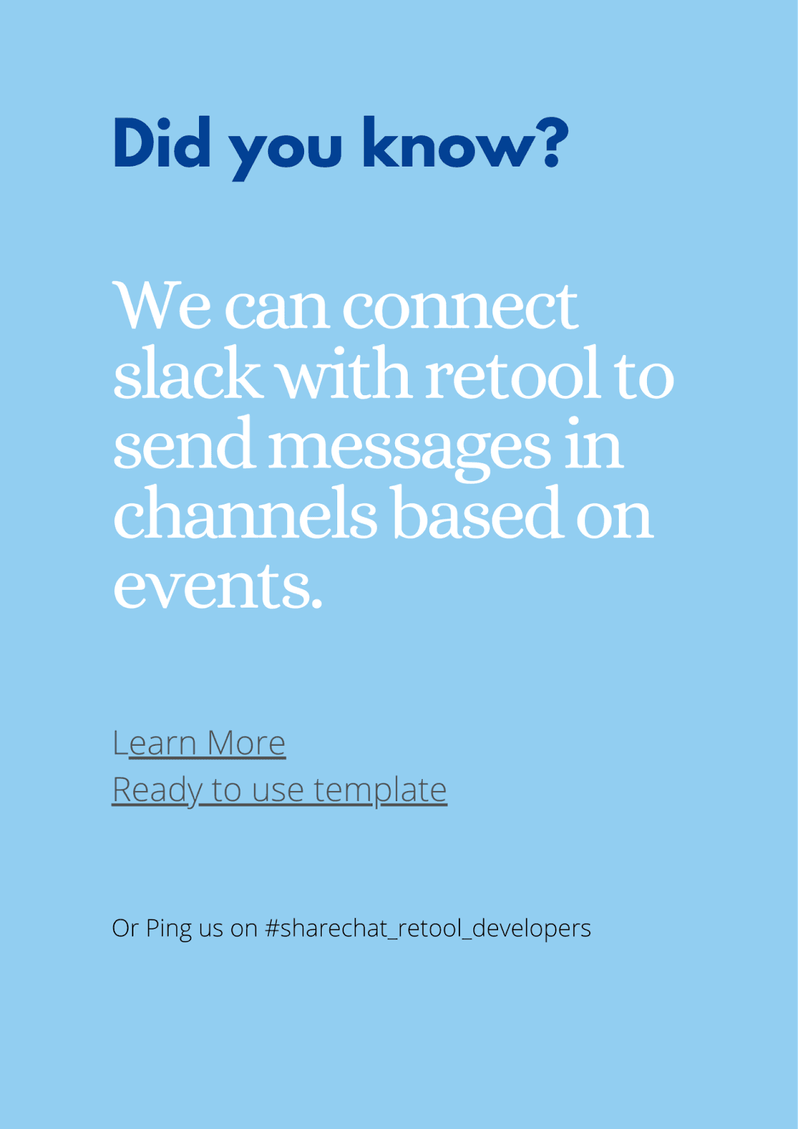 Over time, ShareChat has evolved the way everyone builds tools and operates internally. To get there, Akshat recommends creating a culture where teams can build apps to solve their own use cases. For example, the Tools Team reminds folks about what they can build through an internal video series. The videos teach ShareChat teams how to write efficient queries, integrate the ShareChat API, and optimize their apps in Retool. They also put up “Did you know” posters around the office to encourage app building. They display messages like, “Did you know you can integrate Slack with Retool apps.”