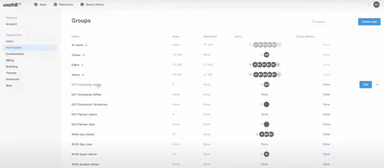 Authentication touched all sides of the marketplace, and permissions were only going to get more complex as the product evolved. Retool offered Mike and his team a way to provision users with granular permissions that also worked with Westhill’s tech stack. Group permissions↗ in Retool would control page level access, and the same permissions mapped in Westhill’s database would control data level access.