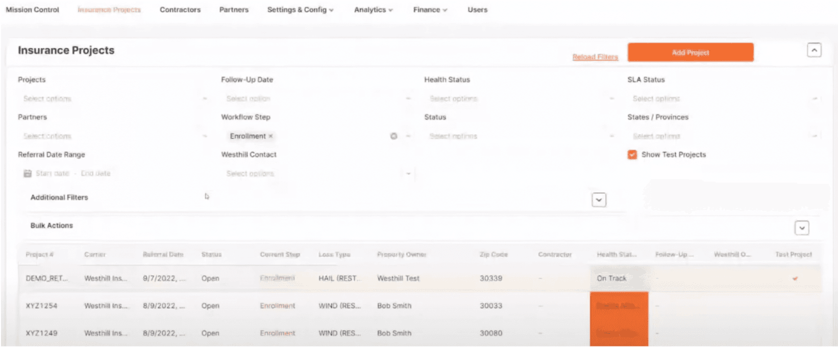 A fully featured internal admin UI was built on top of Retool for internal operations at Westhill. This internal interface includes a running list of insurance repair projects, their status in the project workflow, and operational capabilities—like assigning contractors.