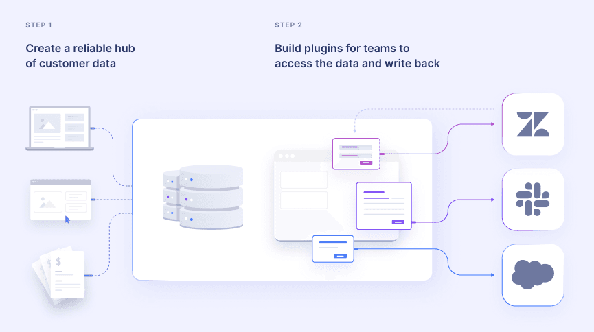 The early Segment team spent a lot of energy exposing data everywhere via their automations and plugins. “This ethos created a virtuous cycle for us. We treated data as a service and built plugins to expose it in various parts throughout the org. Dozens of small apps could read from and write to our data sources, and over time this meant we were incredibly fast in building any experience internal employees needed from an operational perspective.”